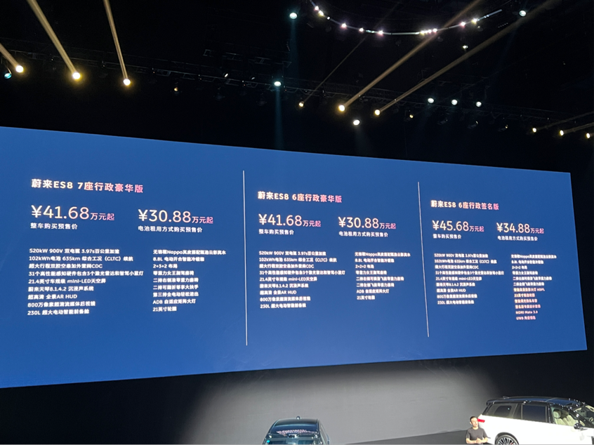 2025年8月21日,蔚来汽车旗下全场景科技SUV车型——蔚来全新ES8正式开启预售。新车共推出六座/七座共三款车型,整车购买预售价格区间为41.68万元-45.68万元,电池租用方式购买预售价为30.88万元-34.88万元。同时,蔚来还推出了全新ES8的专属复购权益,并宣布从现在起至上市发布,支付5000元预订金可抵10000元购车款。此次换新,全新ES8从此前的中大型SUV升级为大型SUV,不仅在外观、空间等方面进行升级,还搭载5nm车规工艺高阶智能辅助驾驶芯片——神玑NX9031、SkyOS·天枢整车全域操作系统以及AI智能底盘等科技,新车预计将在9月下旬正式上市。