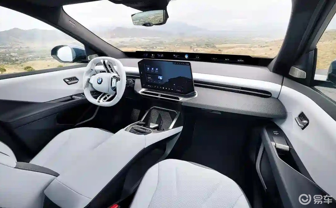 进入车内,新世代iX3营造出不错的科技氛围感,视觉上自上而下配有3D抬头显示、视平线全景显示、中控大屏。其中,视平线全景显示系统在挡风玻璃上形成近40英寸、4K分辨率的投影画面,视觉上比较震撼。新车会依据不同版本提供两款样式方向盘,其中包括一款竖条方向盘,比较特别。中控屏采用类似于“缺角”的异形设计,预计会有不错的表现。