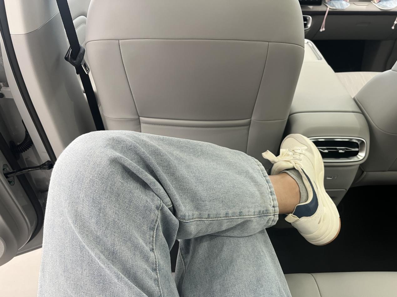 零跑B10的车身长度和轴距都比银河E5小一些,它的车身长度为4515mm,轴距长度为2735mm,按道理,零跑B10的空间应该更紧凑,但是实际的体验下来,零跑B10的空间表现同样很出色。大家可以看到,零跑B10的腿部空间明显比银河E5更宽敞,这是因为零跑B10具有87.4%得房率,在同级中数一数二。