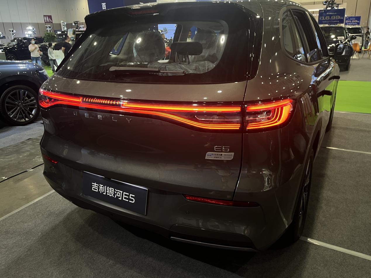 银河E5的整体造型基本延续了家族式的设计语言,车头造型比较饱满大气,凸出的车鼻搭配犀利的LED大灯,开出去还是很有辨识度。这款车的尾灯造型很时髦,当下比较流行的贯穿式设计,若隐若现的腰线从尾灯勾勒而出,搭配隐藏式门把手、花瓣式铝合金轮毂,整体的设计还是比较动感。