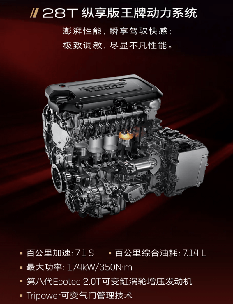 动力方面,君威搭载两套动力系统,精准匹配不同需求:28T纵享版采用第八代Ecotec 2.0T 可变缸涡轮增压发动机+9速智能变速箱的“双十佳”组合,可爆发174kW最大功率,1500-4000rpm转速区间持续输出350Nm峰值扭矩,动力响应迅猛;25T超享版则配备第八代Ecotec 1.5T四缸直喷涡轮增压发动机+9速智能变速箱,124kW最大功率与 1700-4400rpm宽广区间的250Nm扭矩,兼顾动力与日常实用性。