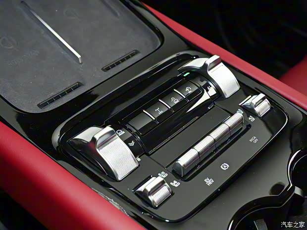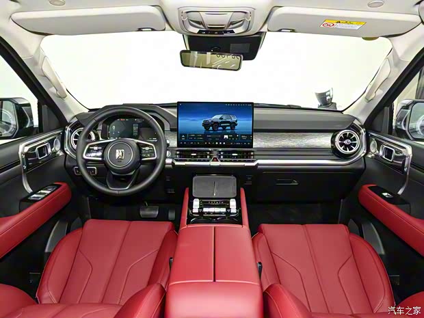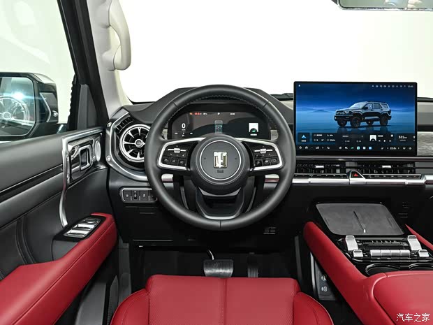 接下来我们来到车内,内饰提供永夜黑、星冕红和月影灰供用户选择。此外新款换装怀挡之后,对副仪表台区域进行了重新设计,视觉上更加规整,也简洁了不少。从前往后依次是两块无线充电面板、带有金属质感的越野功能控制区域,最后以两个杯架收尾,各个功能区的区分更清晰。