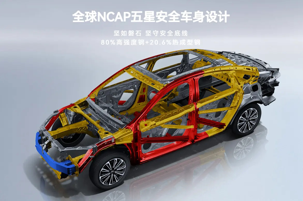 基于全球五星安全标准设计的车身结构,采用80%高强度钢和20.6%热成型钢,打造出坚固的乘员舱笼式结构;铝合金前防撞梁覆盖率高达78.13%,能更有效吸收和分散碰撞能量.