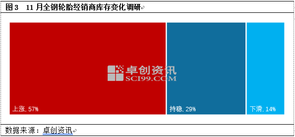 本月天气进一步转冷,轮胎终端磨损增多,加上部分地区户外作业开工下滑,全钢轮胎市场季节性走弱,轮胎向下传导放缓,经销商库存消耗不畅,整体呈增长趋势。但是部分经销商由于前期库存水平已经累至高位,本月有意控制库存,整体库存变化不大。甚至个别经销商对未来市场预期不佳,有意减低库存,减少资金压力,库存呈走低趋势。