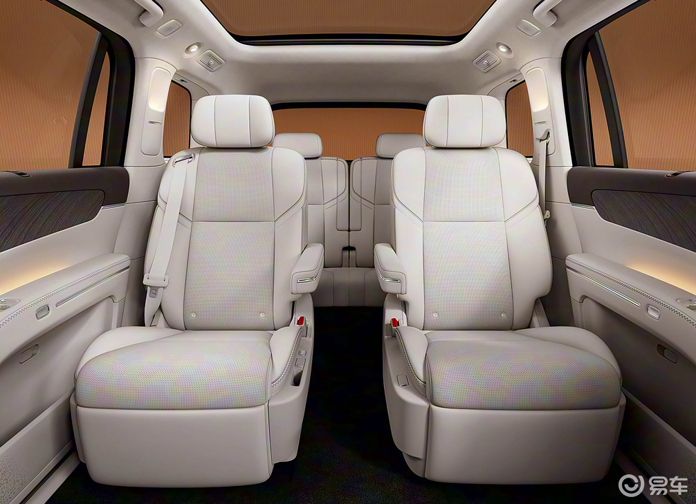新车提供5/6/7座多种座椅布局,二排配有零重力座椅,带有腿托、独立扶手,支持120°零压躺姿+4向腿托调节,迎宾模式下可形成195mm超宽中央通道。包括二排遮阳帘、21.4英寸吸顶屏、支持-6°C至50°C调节的车规级冷暖冰箱、带嵌入式杯托设计的双折叠桌板等配置也一应俱全。