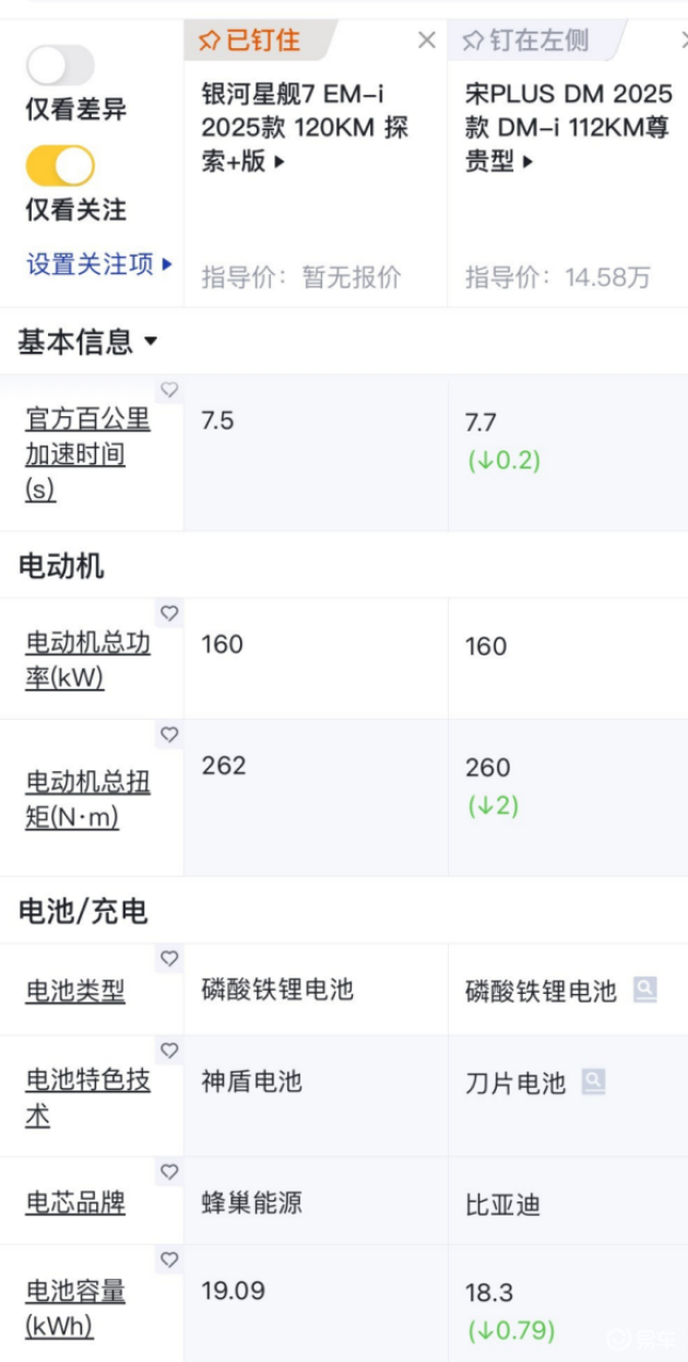 宋PLUS DM-i搭载了18.3度电的比亚迪刀片电池,而银河星舰7 EM-i则配备了19.09度电的神盾短刀电池。在高速行驶表现方面,银河星舰7 EM-i宣称其动力系统可以实现155km/h连续运行两小时,性能不会衰减,这一点对于消费者来说无疑是一个重要亮点。