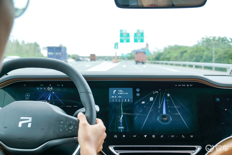 据厂家介绍,飞凡R7全车配备了33颗感知硬件,包含了1颗LUMINAR高规激光雷达、2颗4D成像雷达、4颗远距离点云角雷达、12颗超声波雷达、12个高感知摄像头、1个高精度定位单元等,并且配备了英伟达 Orin X超算力智驾芯片。RISING PILOT智驾系统采用了FULL FUSION全融合算法,据称可以拥有更迅速的判断及更准确的识别。不过略有遗憾的是,我们此次试驾的车型并未配备LUMINAR高规激光雷达,不过对于体验高速智能领航辅助并不构成太大影响。
