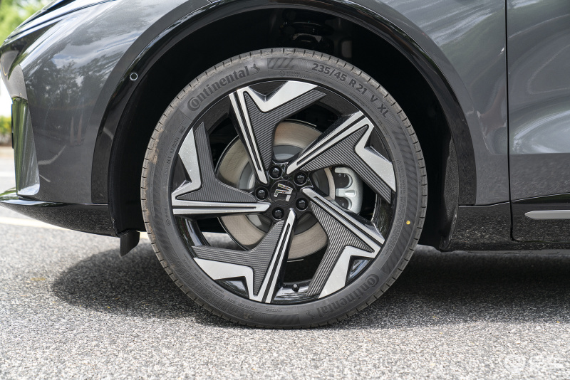 树叉状的5辐21寸轮圈绝对是R7造型上不可或缺的设计元素,这套轮圈与车辆造型的匹配度及行驶时的视觉效果都无可挑剔。此外,由于前后轮输出扭矩不同,前后轮胎的规格也有差别,前轮胎规格为235/45 R21,后轮胎规格为265/40 R21,轮胎型号为德国马牌PCC。