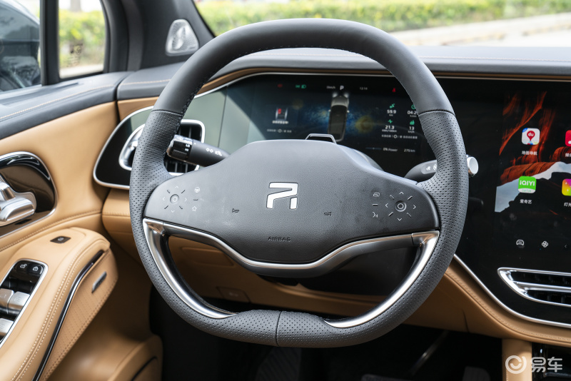 方向盘的造型与智己L7颇为相似,并且同样采用了上下齐平的设计。方向盘并没有机械按键,而是采用了带震动反馈的触碰式设计,反馈质感比较清晰,方向盘后方还有一个驾驶员状态监测摄像头。