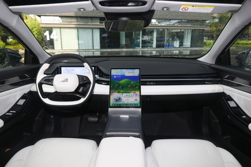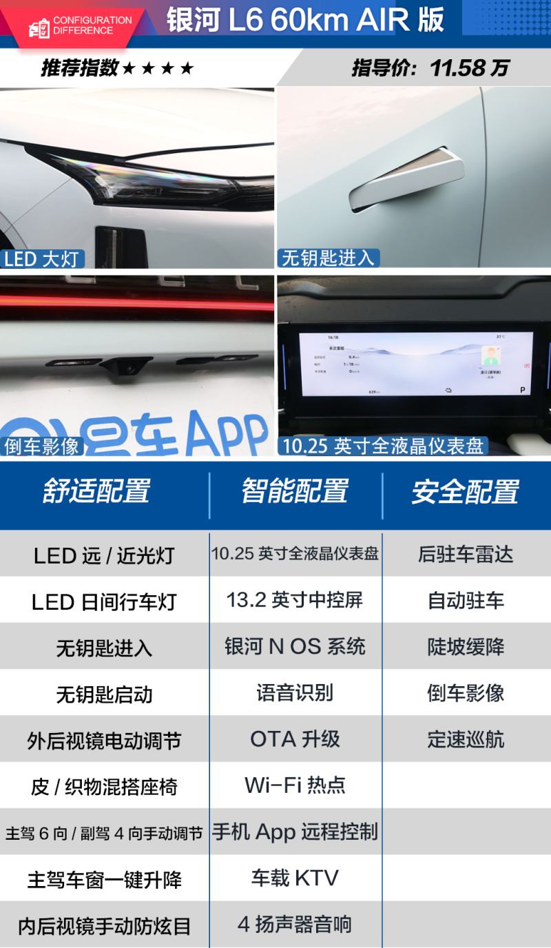 先来看看全系最便宜的车型吧,那就是售价为11.58万元的60km AIR版。由于银河L6全系都采用了一样的动力组合,所以我们不用在动力方面过多考虑,只需要从配置方面去考虑就可以了。虽然是全系最便宜的车型,但是基础配置还是比较齐全的,像LED大灯、无钥匙启动、无钥匙进入、倒车影像、定速巡航、手机APP远程控制都配备到位了。而在车内,10.25英寸+13.2英寸的屏幕以及内置的高通8155车机芯片也并没有缺席。不过60km AIR版车型并没有配备天窗,对于喜欢大天窗的消费者可能会是一种遗憾,不过结合11.58万元的价格来说,整体的性价比还是相当高的。
