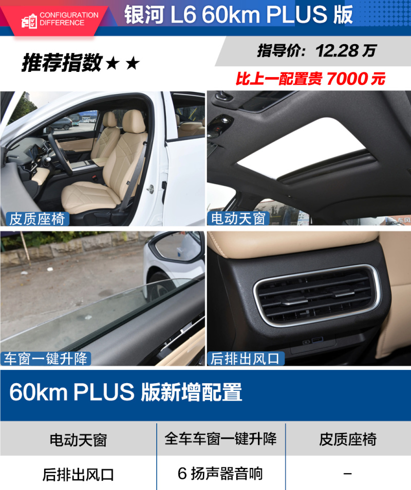 紧接着要说的就是售价为12.28万元的60km PLUS版车型了,相比60km AIR版车型价格贵了7000元。主要提升的都是一些舒适性配置,如全车车窗一键升降、电动天窗以及后排出风口,扬声器数量也提升到了6个,座椅材质也采用了全仿皮包裹,除此以外60km PLUS版车型的提升就不多了。相比60km AIR版车型的升级并不算多,也并都不是太会影响消费者选择的配置,整体性价比并不如60km AIR版车型。