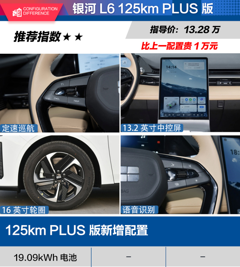 编辑点评:可以说银河L6这次的诚意是相当足的,11.58-14.98万元的价格区间也属于是相当合理的,当然这辆车许多的体验感受无法从配置方面去体现出来,还需要你亲自去试驾才能体会到。而回归车辆配置本身,如果你预算充足,那么顶配的125km 星舰版车型就会是你最好的选择,配置最齐全,更能满足日常驾驶的所有需求。除此以外,我其实最推荐60km AIR版也就是最低配车型,结合售价来看,这辆车的性价比恐怕是全系最高的了。