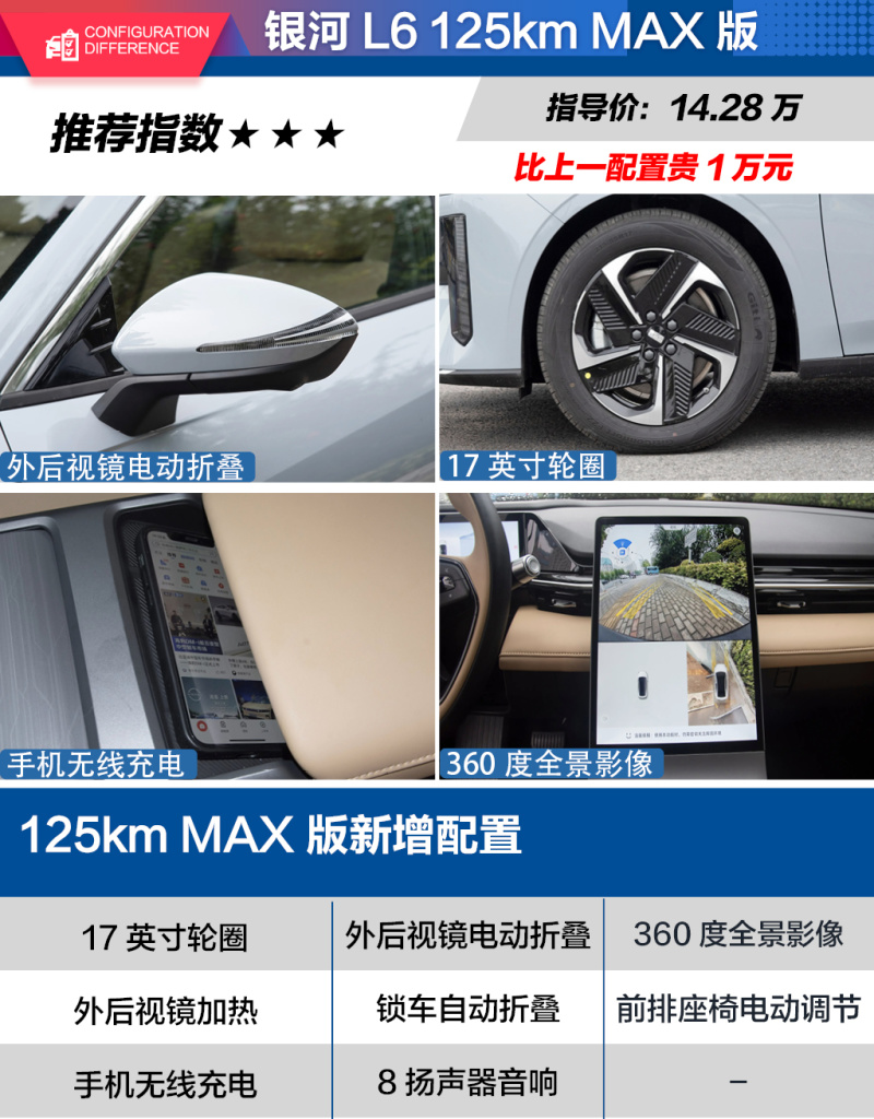 接下来的就是次顶配车型,售价为14.28万元的125km MAX版车型,相比125km PLUS版车型要贵了10000元。不过配置的提升也是比较明显的,首先外后视镜增加了电动折叠、后视镜加热以及锁车自动折叠功能,而像360度全景影像、前排座椅电动调节、手机无线充电等实用配置也配备到了车型,扬声器数量进一步提升到8个,轮圈尺寸也升级到17英寸。可以说125km MAX版车型的配置提升是比较到位的,基本上可以满足日常使用的各项需求了,如果没有顶配车型,或许还可以让125km MAX版车型的性价比进一步提升。