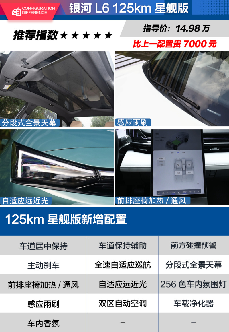 最后就是全系顶配车型了,售价为14.98万元的125km 星舰版车型,相比125km MAX贵了7000元,不过这7000元换来的配置提升觉得可以算得上是物超所值。首先是增加了辅助驾驶方面的功能,包括车道保持辅助、车道居中、前方碰撞预警、主动刹车以及全速自适应巡航,可以实现L2级的辅助驾驶功能。而在舒适性配置方面,分段式全景天幕、前排座椅加热通风和记忆功能、自适应远近光、256色车内氛围灯、感应雨刷、双区自动空调、车载净化器、车内香氛这些。可以说这7000元换来的配置提升是巨大的,对于预算充足的消费者来说,可以直接一步到位选择125km 星舰版车型。