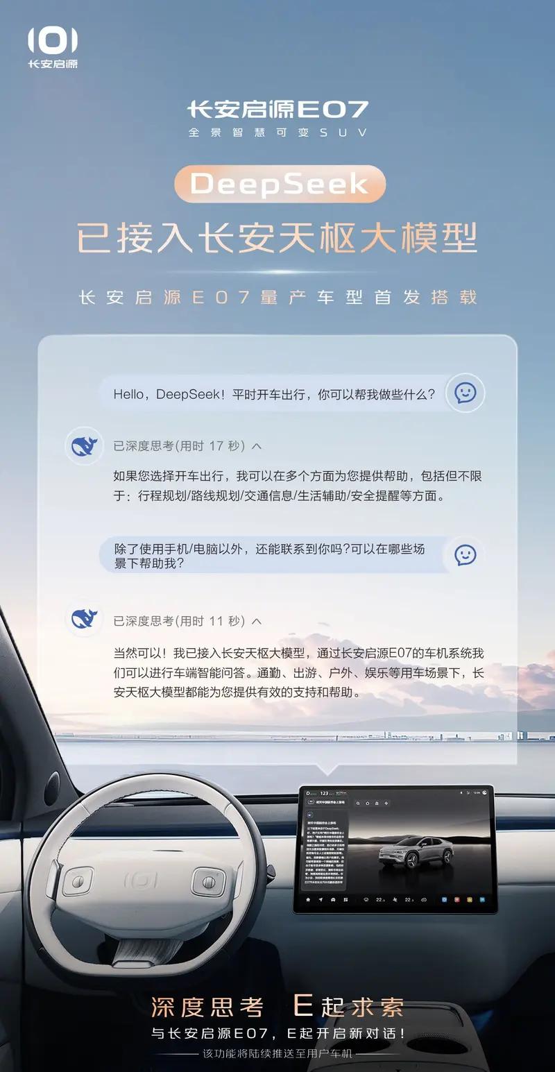2月8日,长安启源官方宣布,DeepSeek已接入长安天枢大模型,长安启源E07量产车型将首发搭载。