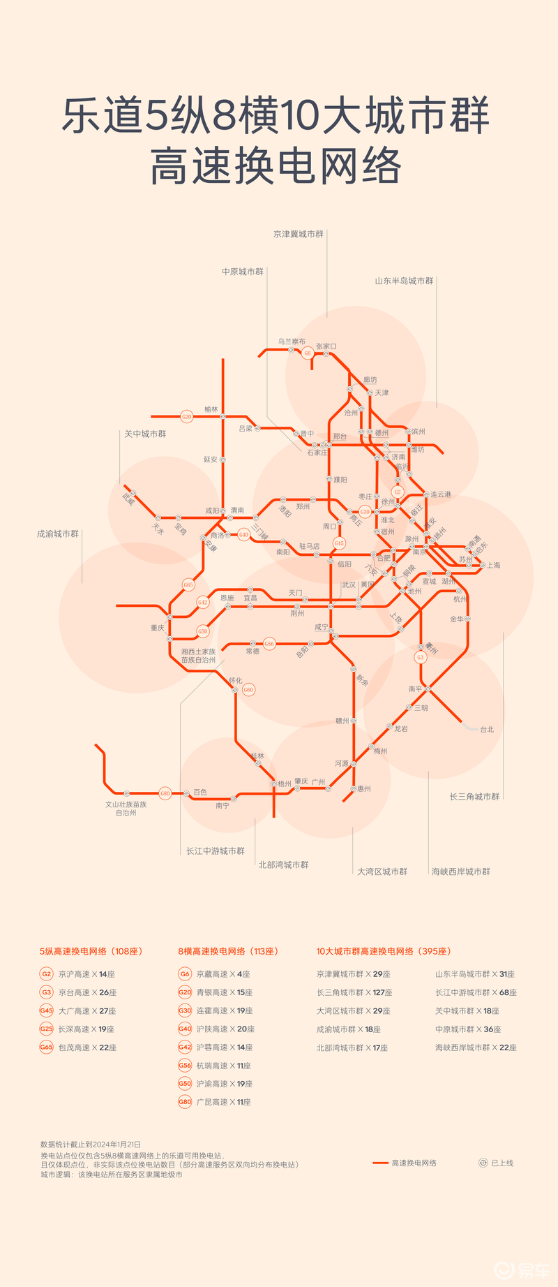 截止目前,乐道已接入超1000座换电站,其中高速服务区换电站超400座,覆盖「5纵8横10大城市群」的高速充换电体系,确保换电站储备2-3块乐道可用电池,让用户快乐返程、安心回家。