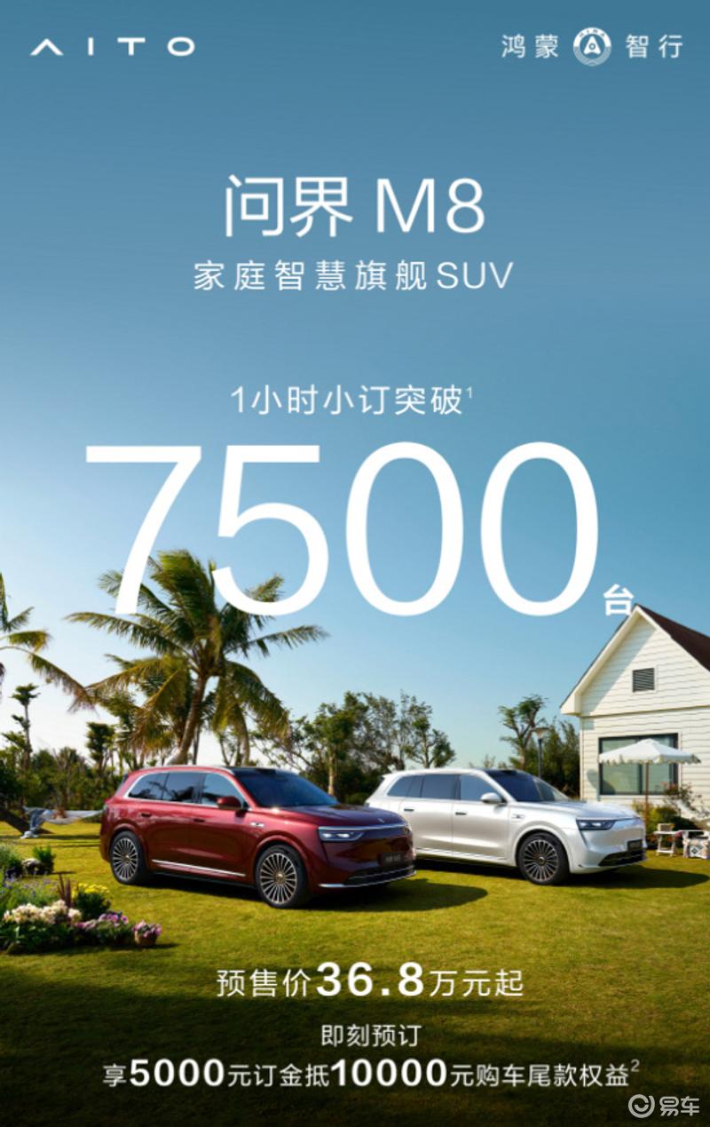 车讯 3月6日,鸿蒙智行宣布旗下全新家庭智慧旗舰SUV问界M8正式开启预订,预售价36.8万元起,新车将于4月上市!即刻下订享5000元订金抵10000元购车尾款权益。最新官方数据显示,问界M8开启预订1小时小订突破7500台。
