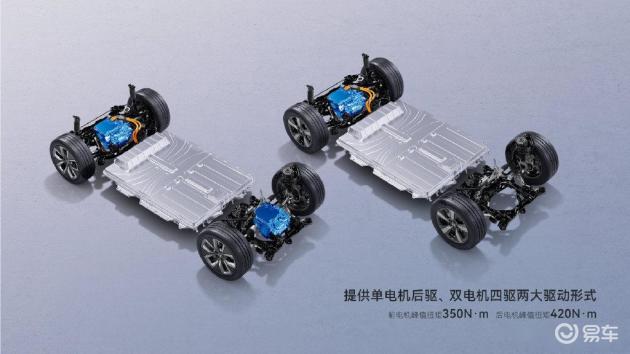 动力上,广汽本田P7提供了单电机后驱和双电机四驱两种动力选择,前电机输出功率150kW,峰值扭矩350N・m;后电机输出功率200kW,峰值扭矩420N・m,百公里加速仅需4.6秒。