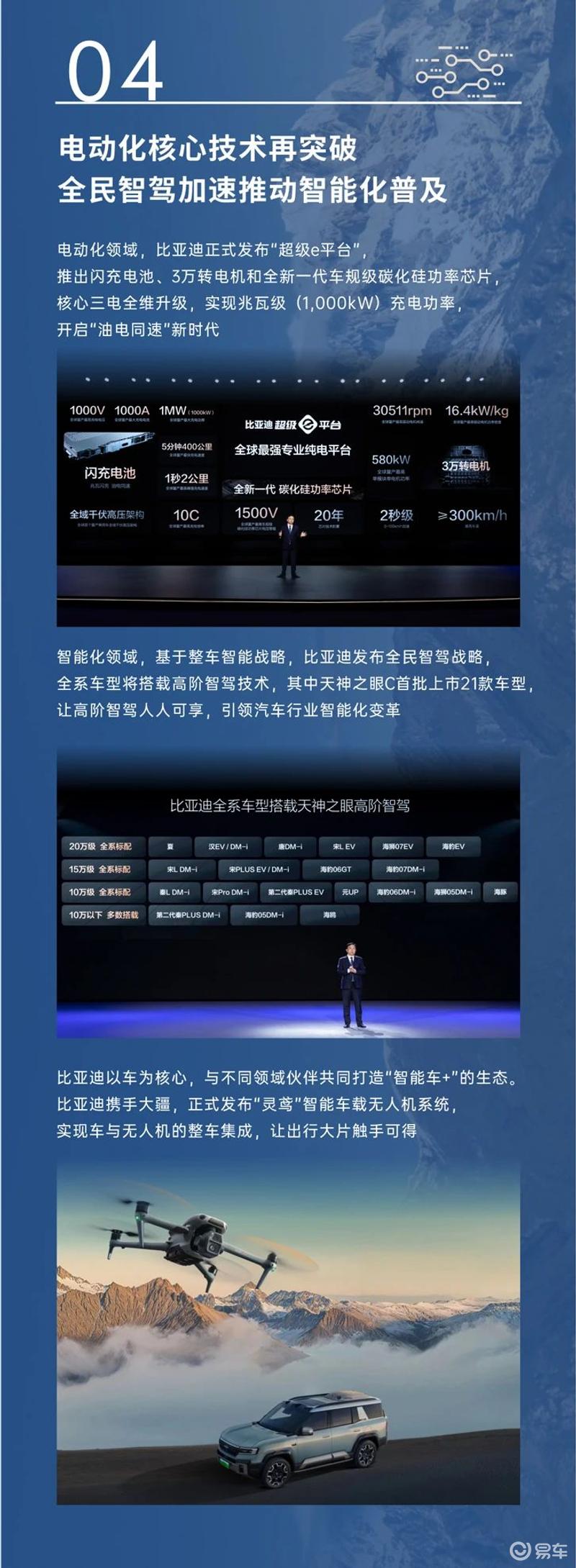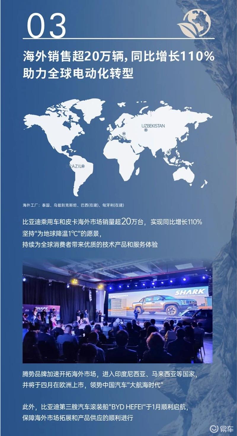 海外销售超20万辆,同比增长110%,助力全球电动化转型。腾势品牌加速开拓海外市场,进入印度尼西亚、马来西亚等国家并将于四月在欧洲上市。此外,比亚迪第三艘汽车滚装船“BYD HEFEI'于1月顺利启航,保障海外市场拓展和产品供应的顺利进行。电动化领域,比亚迪正式发布"超级e平台"推出闪充电池、3万转电机和全新一代车规级碳化硅功率芯片、核心三电全维升级,实现兆瓦级(1000kW)充电功率,开启"油电同速"新时代。