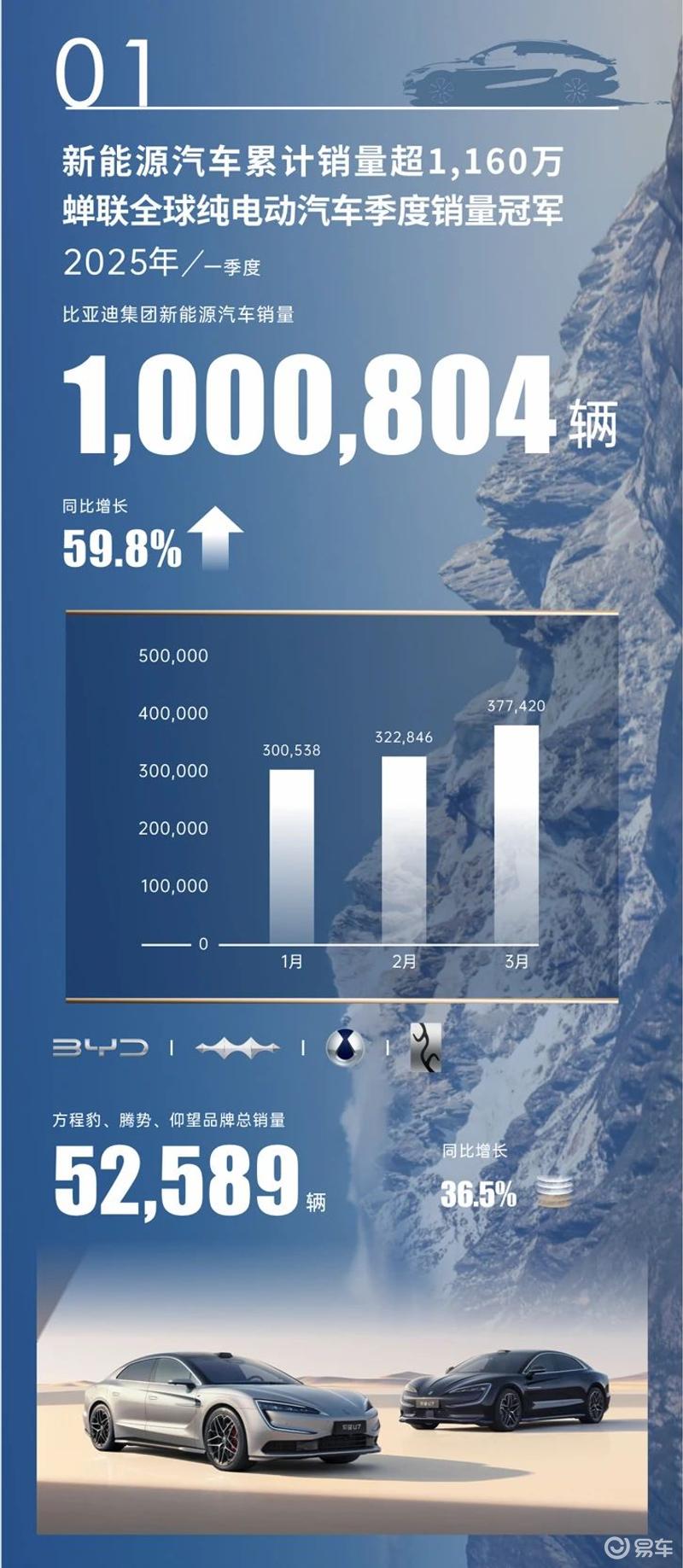 2025年一季度比亚迪集团新能源汽车销量1000804辆,同比增长59.8%。新能源汽车累计销量超1160万辆,蝉联全球纯电动汽车季度销量冠军。2025年比亚迪一季度总营收1704亿元,同比增长36.3%,毛利率20.1%,研发费用142亿元,同比增长34%。实现归属于母公司股东净利润91.5亿元,同比增长100.4%。
