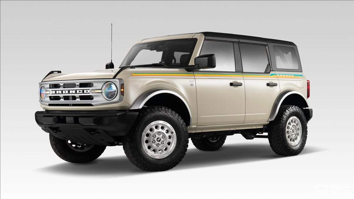 这个外观套件适用于基础版、大弯版、黑钻版和外滩版的四门Bronco。大部分改动都只是外观上的,这个以海滩为主题的套件配备了17英寸银色轮毂、银色轮眉和银色格栅。Bronco车身侧面有亮眼的条纹,软顶车顶上还印有Bronco的标志。