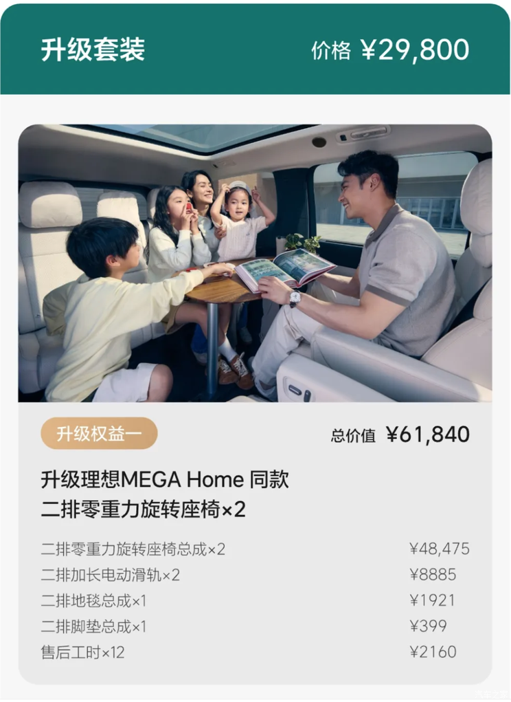 具体来看,理想官方推出的升级套装包含:升级理想MEGA Home同款二排零重力旋转座椅×2;免费改制家用VIP头等舱座椅×2;免费获得理想MEGA Home客厅悬浮大桌板×1。