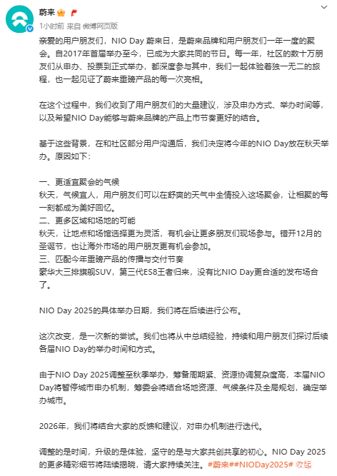蔚来在公告中强调,NIO Day的调整“升级的是体验,坚守的是与用户共创共享的初心”。尽管举办时间变化,但活动的内容设计与用户参与度仍将是核心。更多细节将于后续公布。