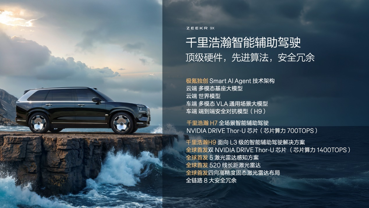 发布会首先讲述了动力部分,极氪9X采用全球首款全栈900V高压电混架构,充电最快,加速也是最快,且是全球极速最高的全尺寸混动SUV。同时在悬架方面,极氪9X采用闭式双腔空气悬架和双阀CCD电磁减振系统。另外,新车还装配了48伏主动稳定杆、5激光雷达和双NVIDIA DRIVE Thor-U芯片。从整体的硬件来看,极氪9X可谓全副武装。