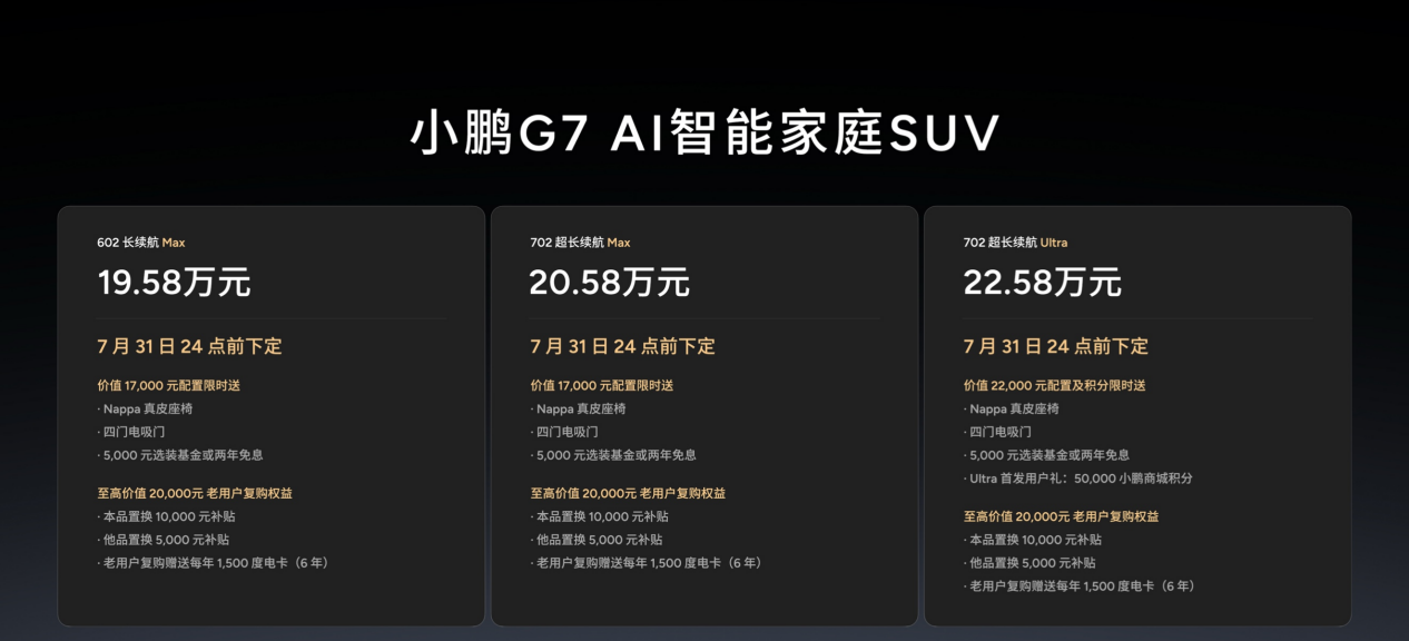 2025年7月3日,小鹏G7正式上市,共推出602长续航Max、702超长续航Max、702超长续航Ultra三个版本,官方指导售价分别为19.58万、20.58万和22.58万,上市即刻可以交付。