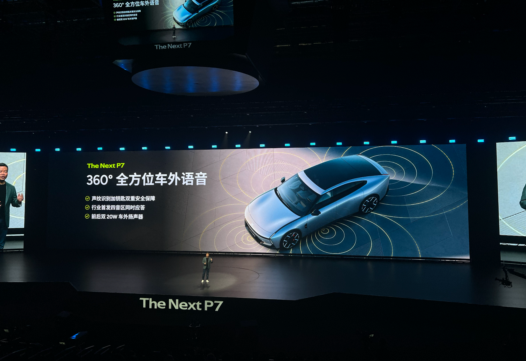 除此之外,全新小鹏P7还有几个很有意思的设计,第一个就是360度的车外语音功能,这台车在前后左右各有一个音区识别,你站在车外就可以直接和它对话,比如打开前备箱、打开后备箱这样的操作。而且为了防止路人误操作,它还专门给加上了声纹钥匙的双重保证。