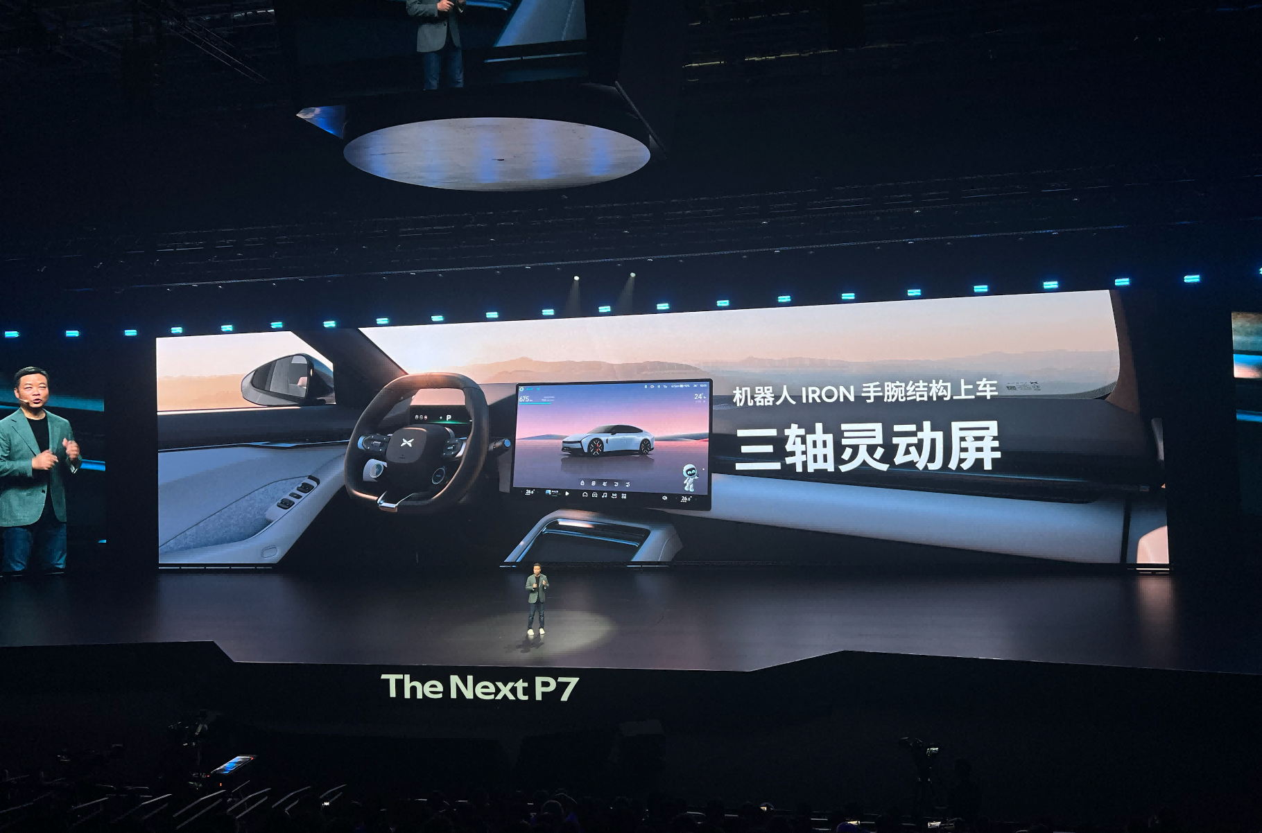来到车内,全新小鹏P7车内最大的亮点,就是这个三轴的灵动屏,它不仅可以实现主副驾方向的屏幕角度调节,还能够上下俯仰调节,这个结构更是用到了机器人IRON的手腕结构,是不是第一次感受到了科技的共通性?
