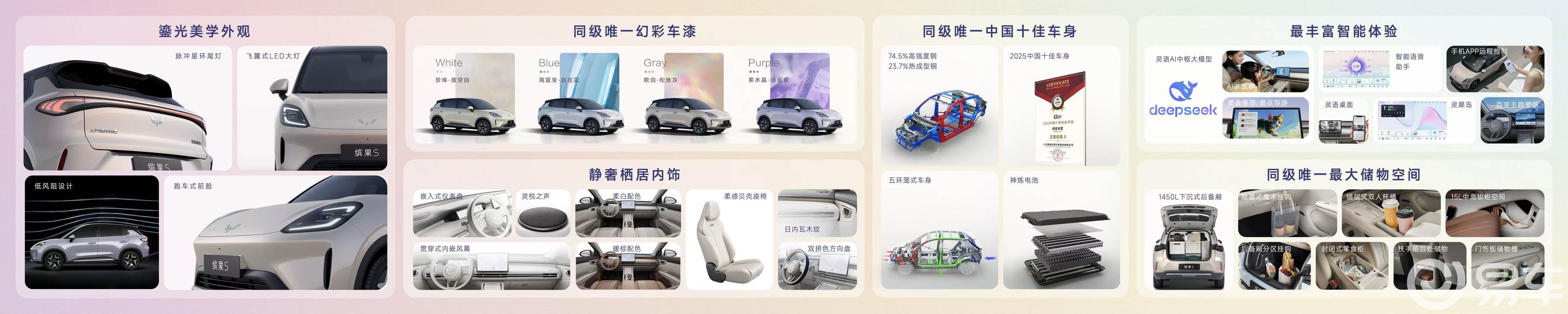 “小车身大空间”是缤果S的核心杀手锏。4265×1785×1600mm的车身尺寸下,84%的得房率让前后排乘客均能舒展自如,1008mm前排头部空间与882mm后排间距,即使180cm身高也能从容落座。更颠覆性的是同级唯一的1450L下沉式后备厢,可轻松容纳5层猫架、露营装备或大型行李箱,配合25处储物空间(含175mm口红槽、开放式补妆台),精准解决女性用户“带娃出行”与“周末远郊游”的收纳痛点。