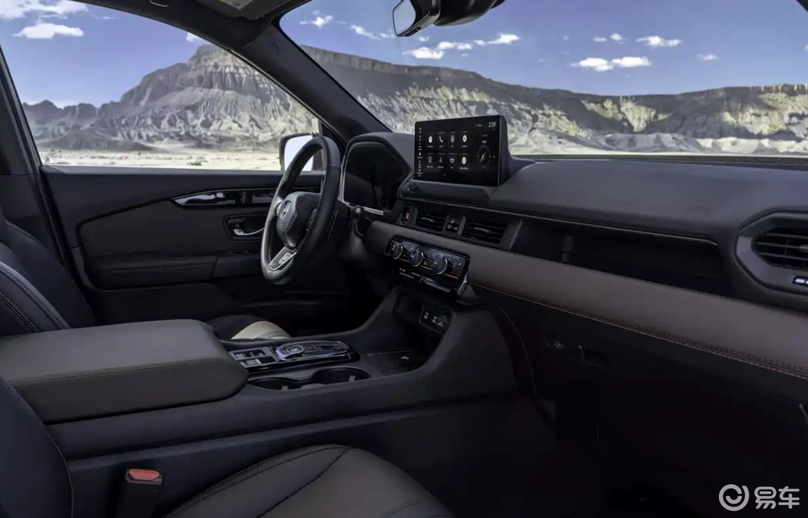 本田飞行员内饰则为典型家族风格,简约平实,使用了更多横向元素,视觉上更具机械感。新车采用了常规造型的圆形方向盘,驾驶舱前围是一个尺寸不大的中控屏,和国内车型有着明显差距。一般来说,国内哪怕几万块钱的车型,也给你一个14.6吋或者15.吋大屏,高清晰,窄边,内置先进的智联功能。本田飞行员则是小尺寸,矩形,宽边,实际面积比国产车小得多,视觉上更低调。